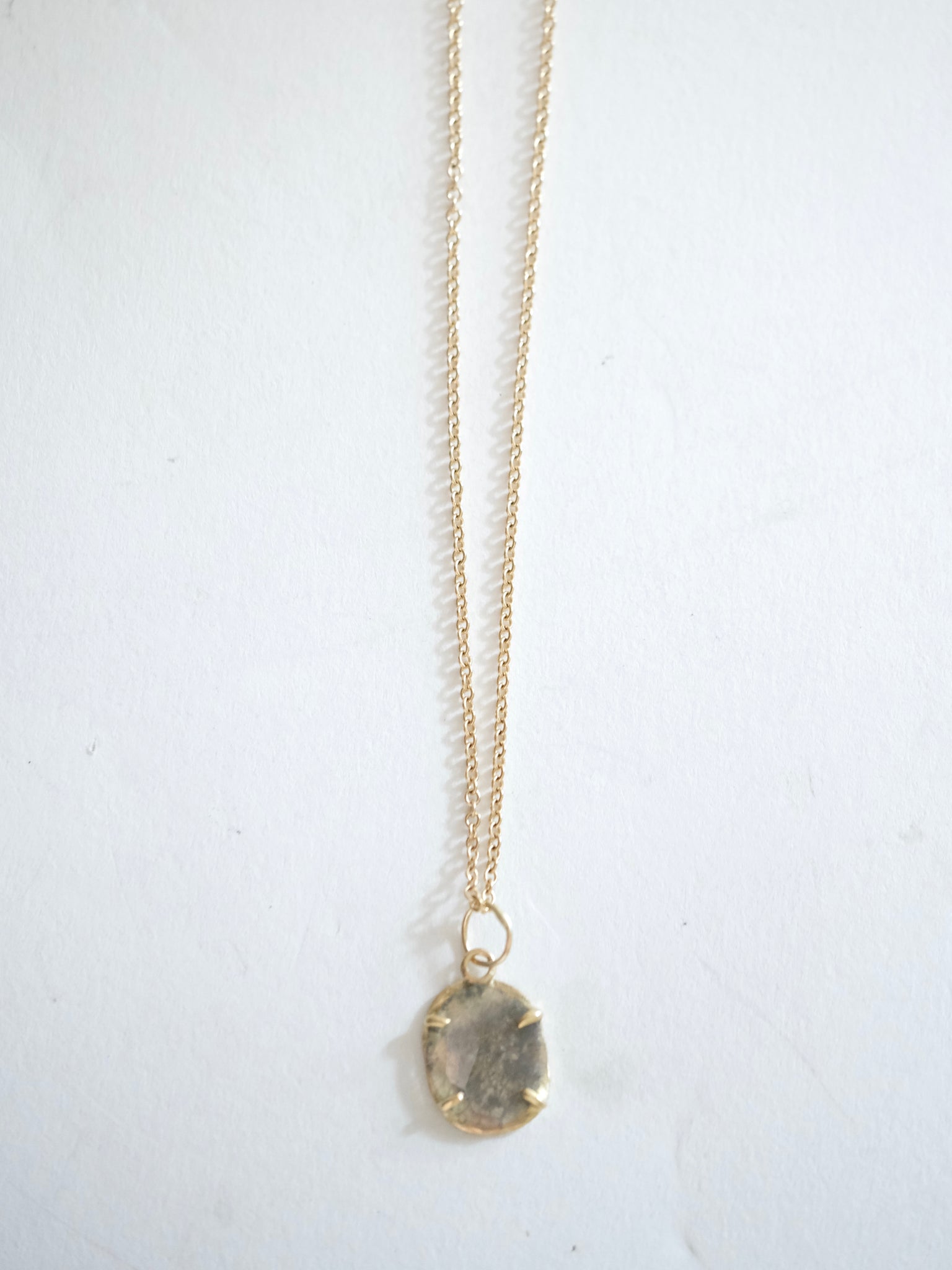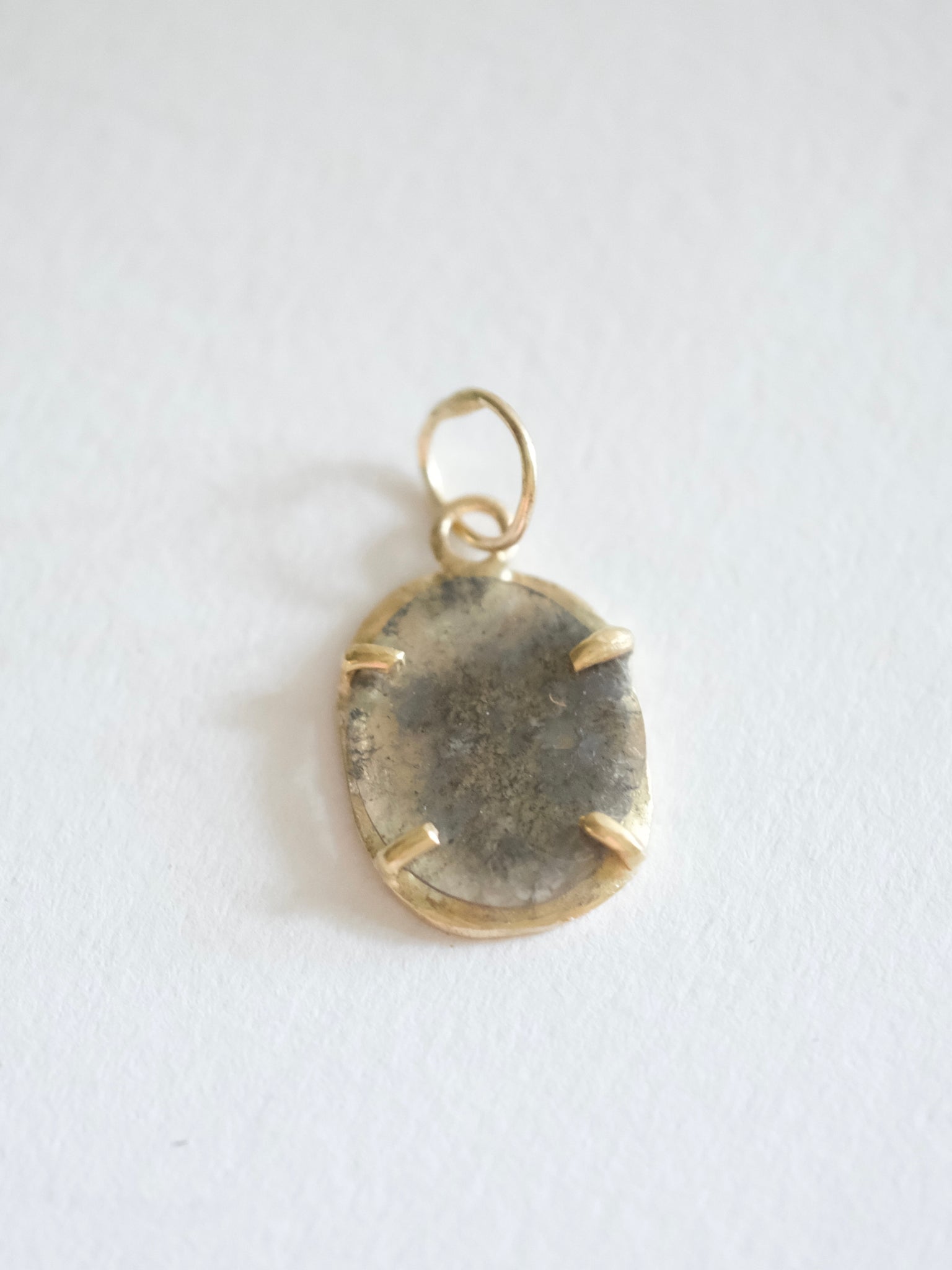 A grey diamond slice pendant prong set on 14k yellow gold.