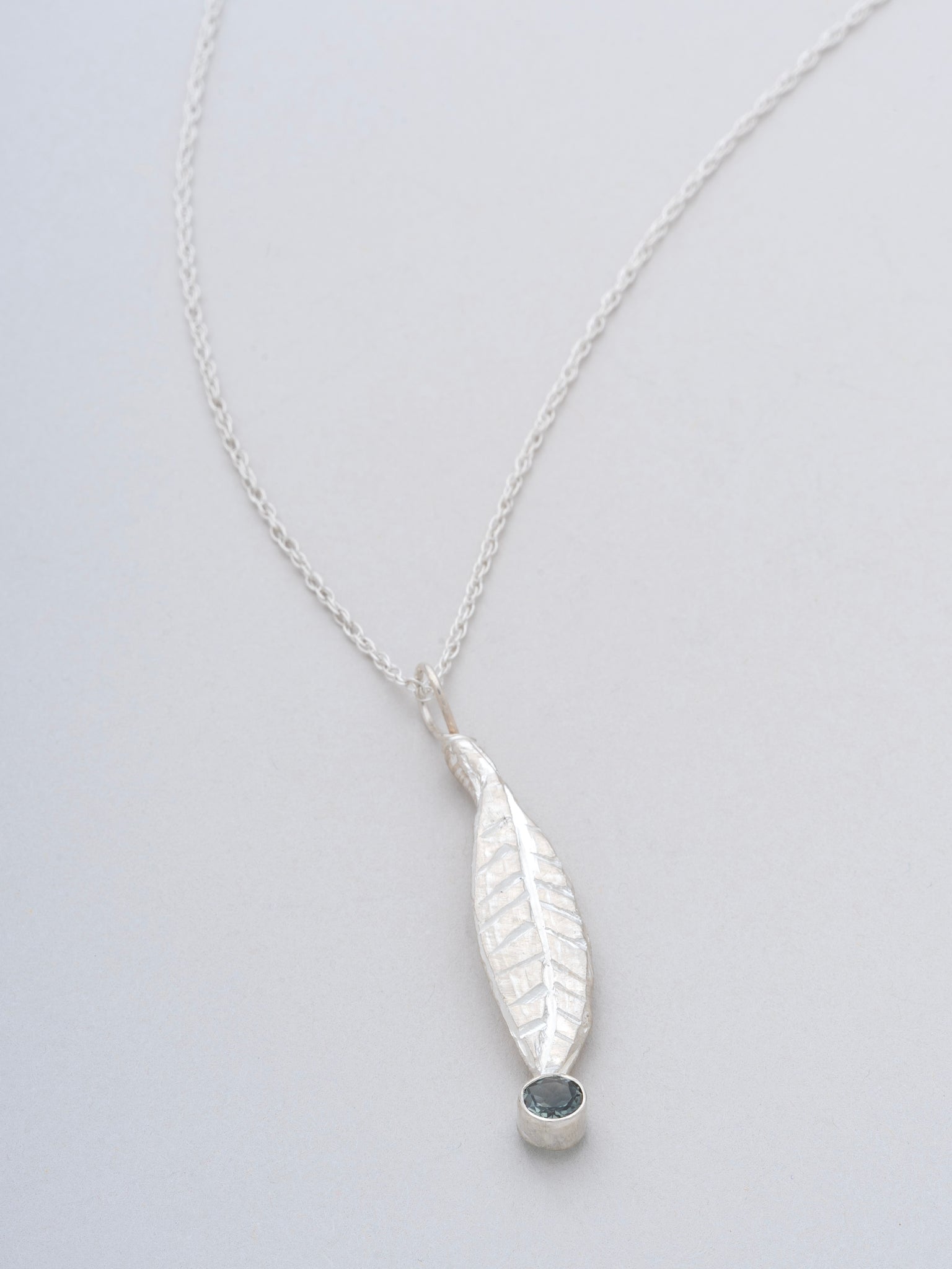 A sterling silver hand carved and lost wax cast lear pendant with a sterling silver bezel set green tourmaline.