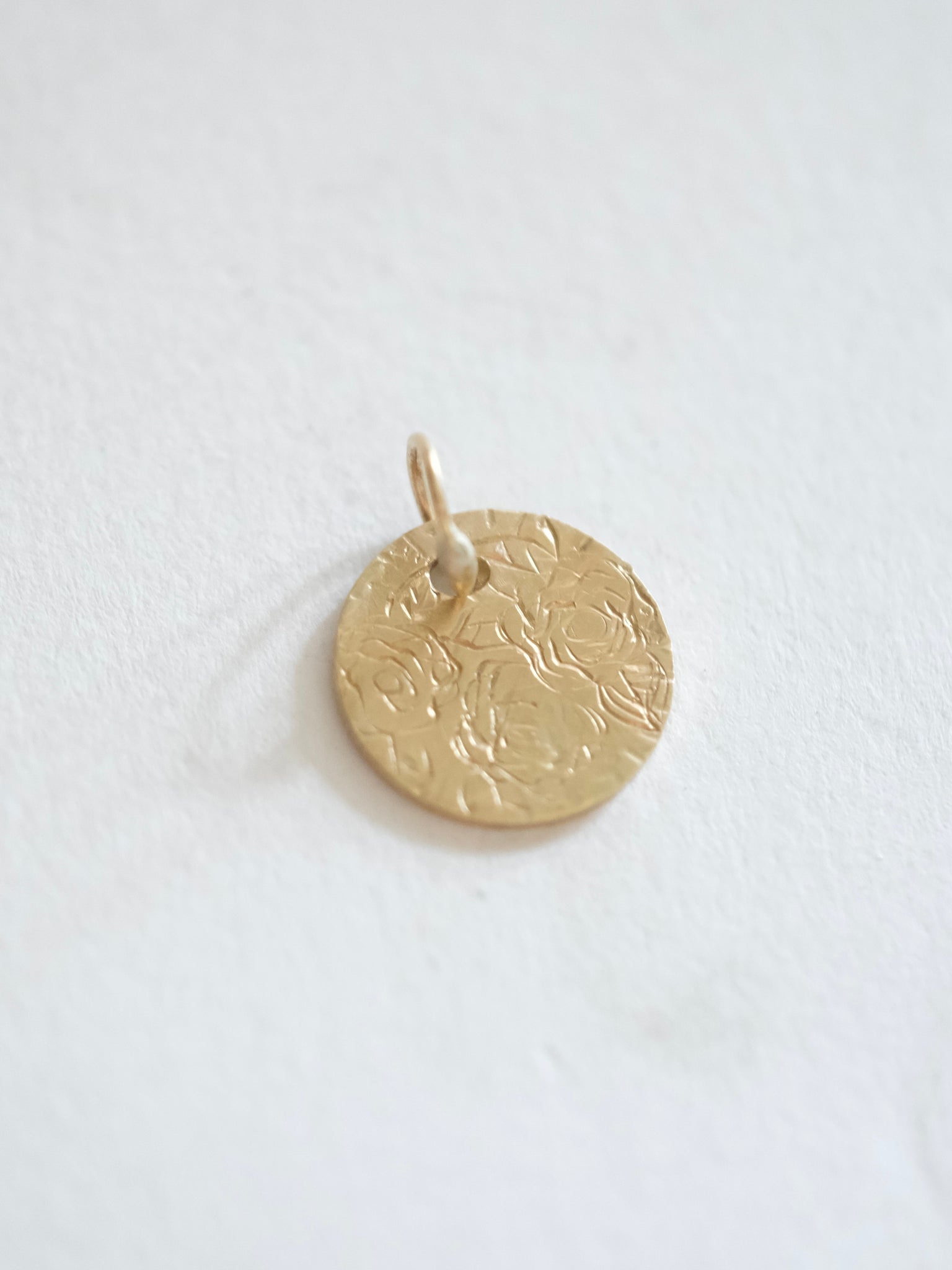 A 12.5mm 14k yellow gold disc pendant that is hand engraved with a “three roses” illustration.